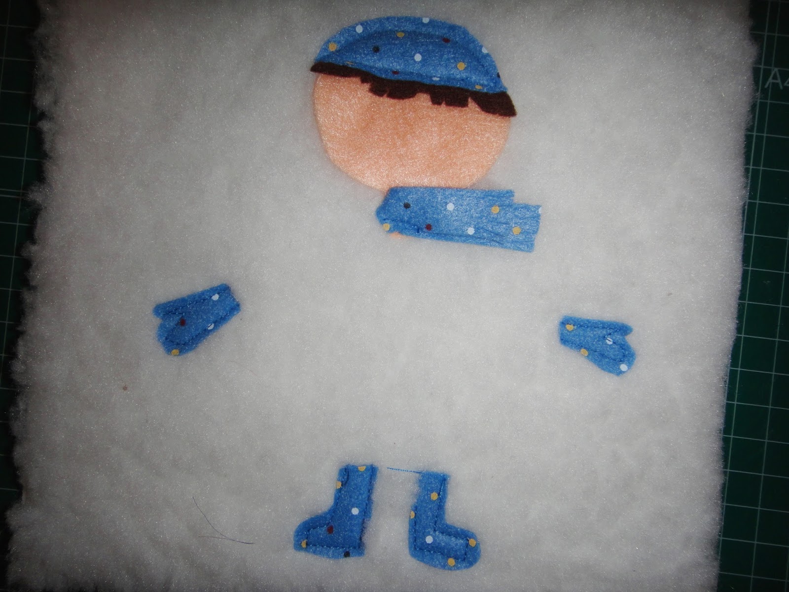 Cortaremos, en el fieltro color carne, un óvalo para el rostro. Con el fieltro marrón haremos pelo y con el fieltro de color los accesorios: gorro, botas, manoplas y bufanda. Colocaremos todo con alfileres en su posición.