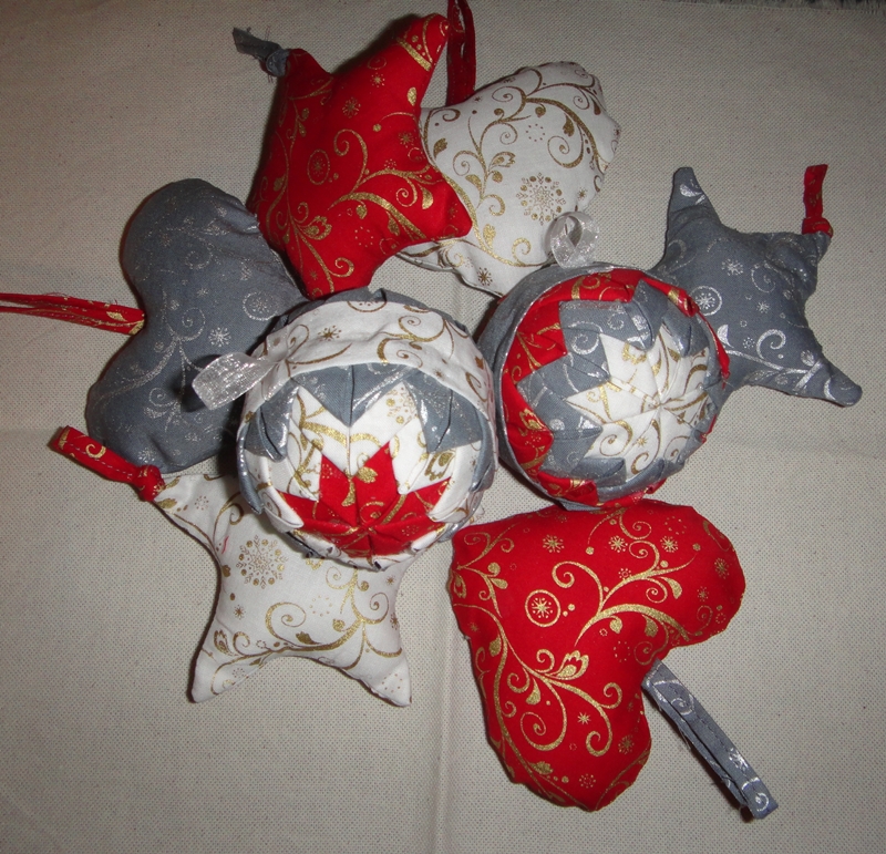 Como me sobraba bastante tela, me he dedicado a hacer más adornos que ya os iré enseñando poco a poco. Os dejo un adelanto en la siguiente foto. De momento solo he hecho adornos de colgar, pero no descarto hacer una corona para poner en la puerta, que la que tengo ya está un poco perjudicada.